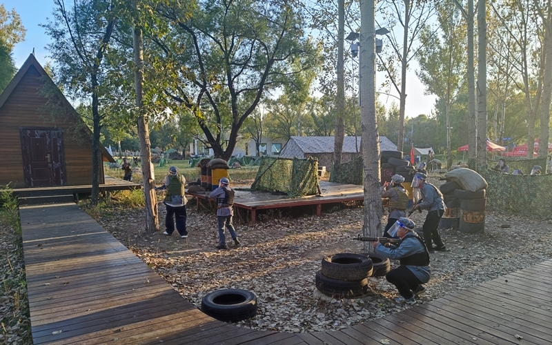 在“重走抗联路”环节,党员们分组完成“抗联西征路”模拟任务,通过“运送军粮”接力、江桥抗战等互动项目,体会抗联战士“火烤胸前暖,风吹背后寒”的战斗环境,通过射箭、手榴弹投掷等军事技能比赛,激发团队协作精神。最后的真人对抗战更将活动推向高潮,青年教师党员表示:“当‘子弹’从耳边呼啸而过时,我才真正理解什么叫‘把一切献给祖国’。”