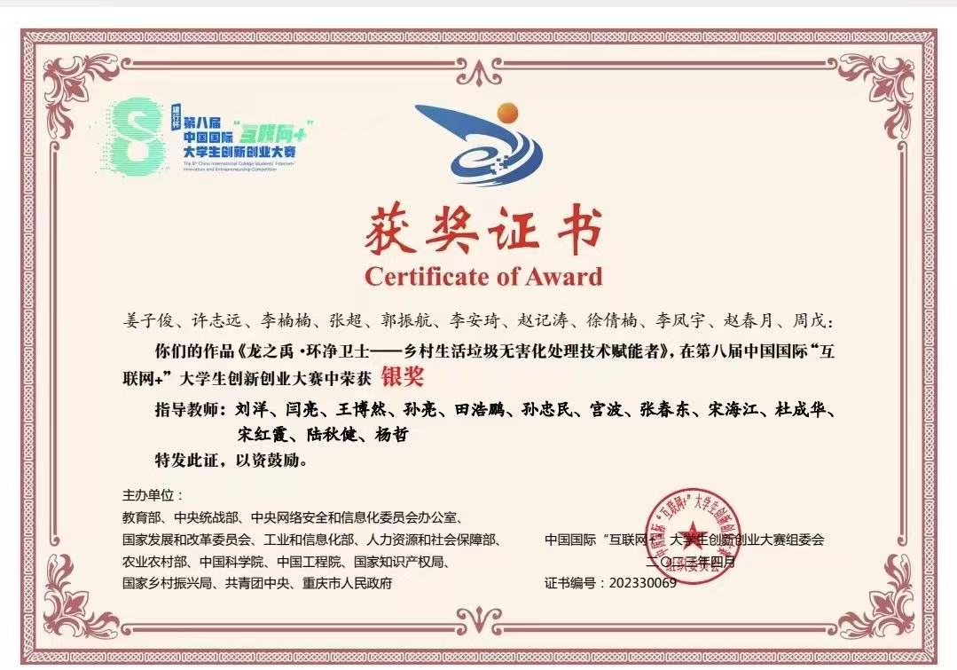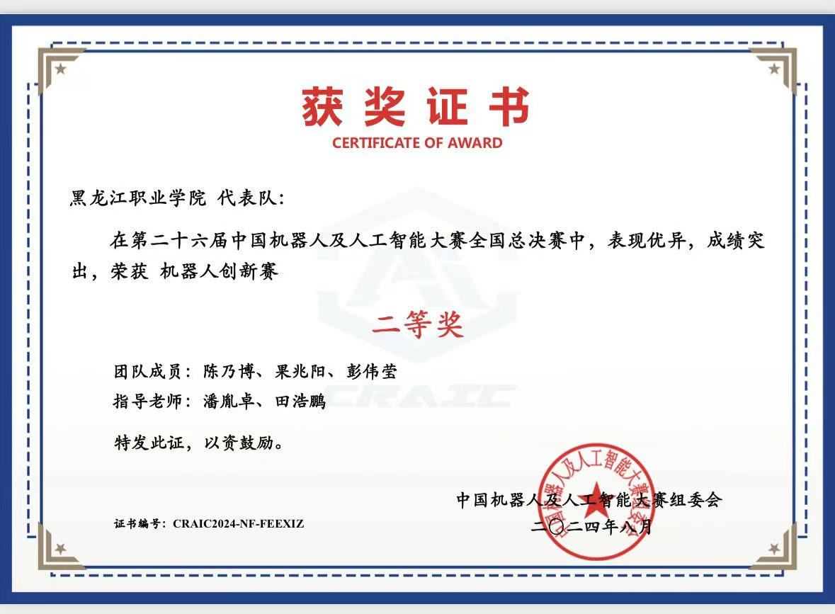 先后荣获2024年世界职业院校技能大赛获得铜奖、2024中国国际大学生创新大赛国赛铜奖、第十四届挑战杯中国大学生创业计划大赛铜奖、第二十六届中国机器人及人工智能大赛二等奖、第七届中国高校智能机器人创意大赛三等奖、第十二届全国大学生光电设计竞赛三等奖等。