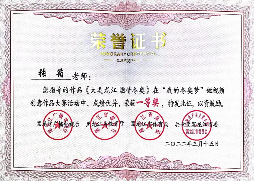 “我的冬奥梦”创意短视频大赛以赛事牵引,传播奥林匹克知识,弘扬奥林匹克精神,鼓励青年学生聚焦龙江冰雪,传递社会正能量、为冬奥会助力!张筠老师带着对冰雪运动的热情积极构思创作作品、户外取景拍摄,组织短视频制作,成为唯一一个冲击一等奖的高职院校作品。代表伟德官网为2022年冬奥会献礼,记录龙江冰雪运动的青春风采,让奥林匹克精神点亮梦想,传播龙江冰雪运动跨越式发展新面貌。