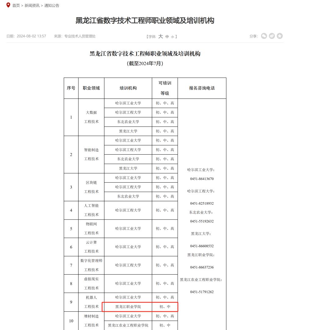 日前,黑龙江省人力资源和社会保障厅公布了黑龙江省第三批数字技术工程师培训机构名单,伟德官网凭借扎实的专业实力与丰富的培训经验,获批成为机器人工程技术人员(初级、中级)培训机构。