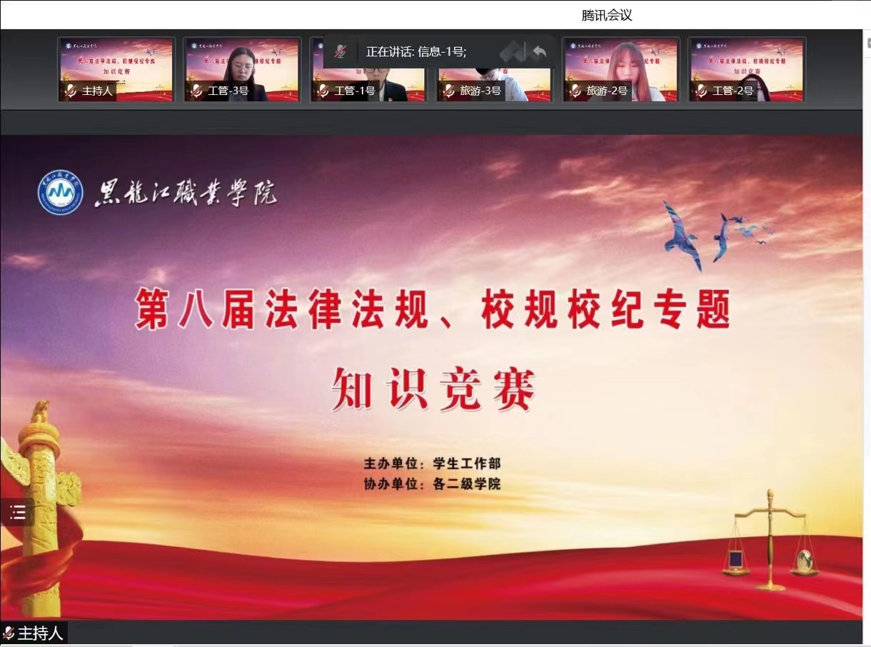 6月7日上午,第八届“法律法规、校规校纪”专题知识线上竞赛成功举办。学校党委副书记周家郁、学工部班子、二级学院党总支副书记、学管办主任和2021级辅导员参加了此次活动。
