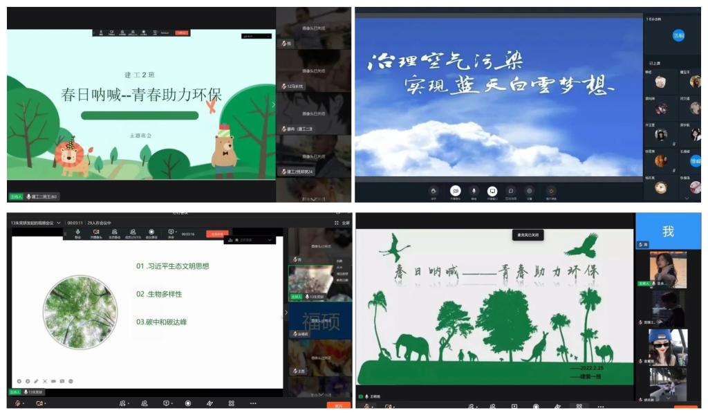 班会主要以组织团员青年学习习近平文明生态文明思想重要论述和故事金句,学习“生物多样性”、“碳中和碳达峰”等重大国家战略相关知识并开展线上“绿色故事会”直播分享,分享自己的绿色养成之路,交流经验心得等形式进行。展示了建筑工程学院学子关注生态环境、积极参与绿色环保活动的良好风貌。