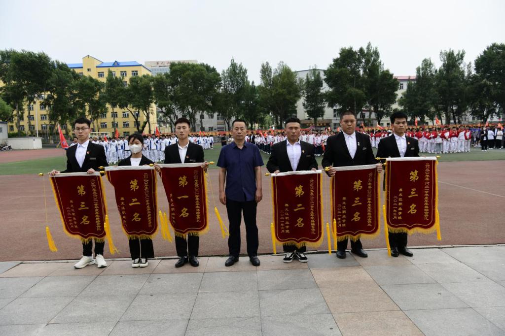 学生处副处长陈宇辉同志宣读2020-2021学年学生早军操评比表彰奖励决定;校团委书记邹春雷为40个获得“军操标兵班”荣誉称号的班级颁奖;学工部直属党支部负责人王英侠为“军操管理委员会”、“国旗护卫队”两个学生团体颁发“组织军操特别贡献奖”;学校党委副书记周家郁为获得“军操综合评比一、二、三等奖”的学院颁奖,其中工商管理学院荣获“军操综合评比一等奖”。