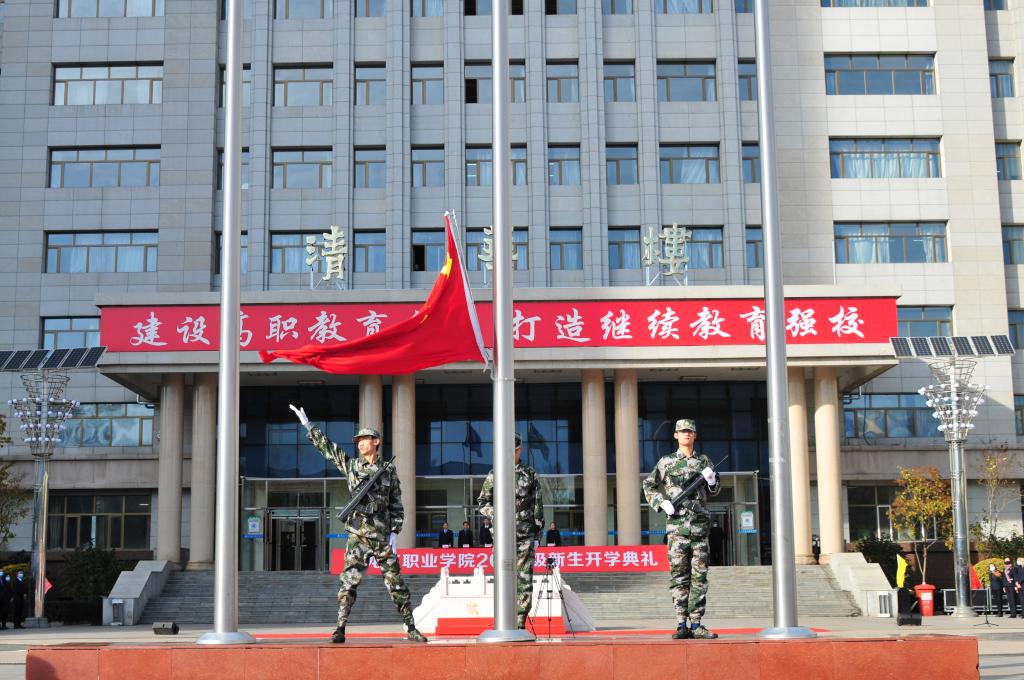 首先进行庄严的升国旗仪式,在国旗班护卫下,国旗在雄壮的国歌声中冉冉升起。随后,各学院新生依次喊出自己学院的口号,并齐声高呼三遍龙职精神“自强有为、兴业报国”,用整齐的阵容和响亮的口号展示同学们良好的精神面貌和昂扬向上的斗志。