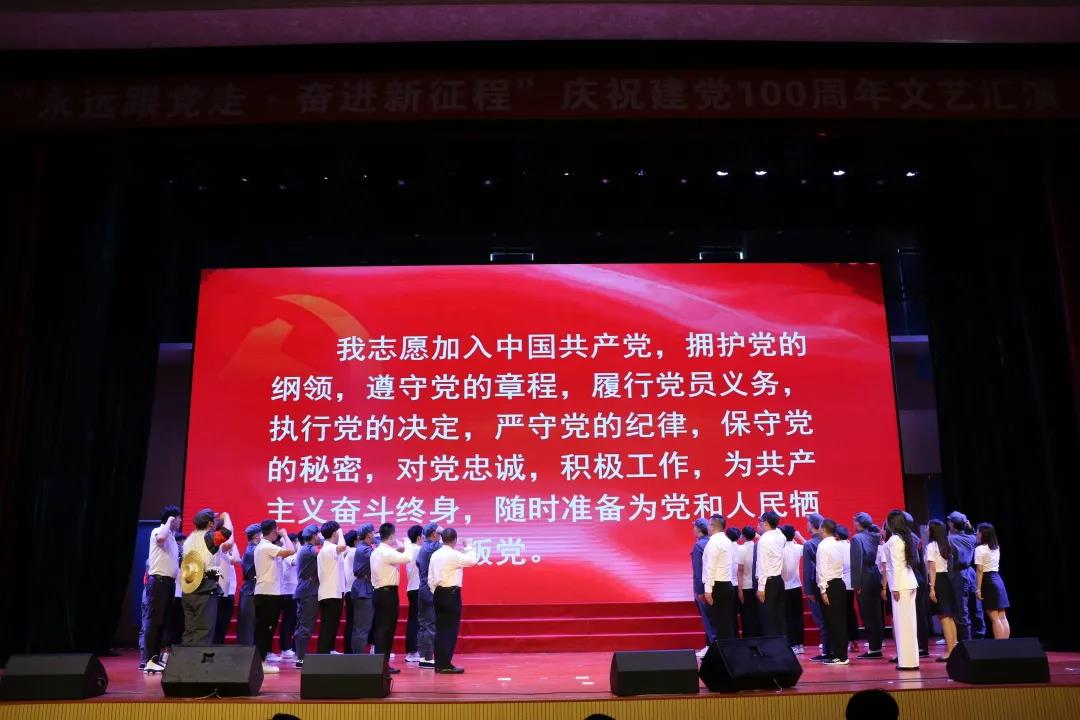并穿插了国家和学校发展进程的照片作以展示,最后在学院师生共同宣读入党誓词中圆满结束。