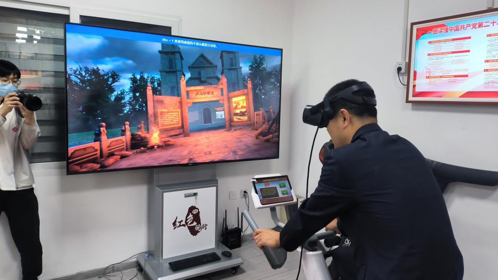 在研究院负责人助理李京洋的带领下,党员同志们依次体验了“VR红色骑行”、“红色情景剧本沙盘”、“VR重走长征路”、“AR互动魔屏军装体验”、“党建思政虚拟仿真实践”等项目。