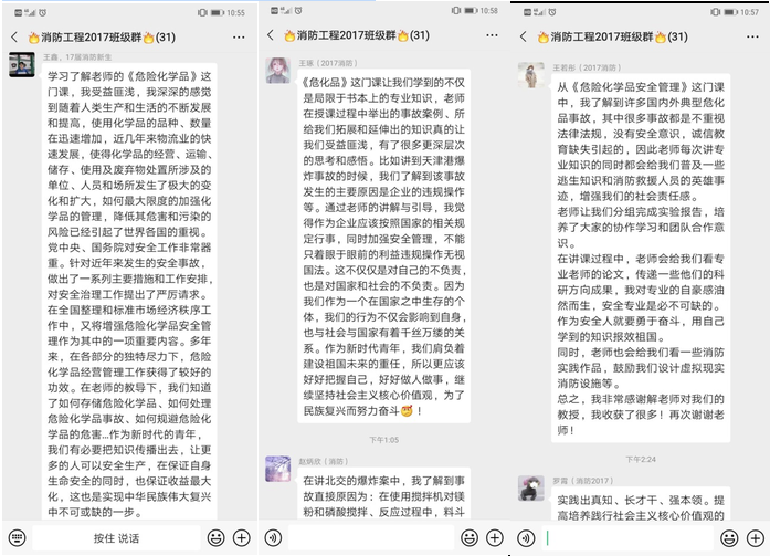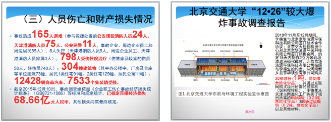“课程思政”建设不是改革。专业课程中本来就有“思政元素”,但需要去深入挖掘、发挥。危险化学品安全管理中涉及到众多安全事故,事故所涉及的人员安全意识和诚信教育缺失、事故应急救援中消防求援人员彰显的爱国奉献精神、事故处理过程中的人文关怀、社会责任及环保意识的体现等都是蕴含在专业课程知识点中的“思政元素”。参考国内典型的危险化学品事故调查报告,如“8.12天津港特别重大火灾爆炸事故”、“12.26北京交大实验室较大爆炸事故”、“3.21响水特别重大爆炸事故”等,结合专业知识点深入挖掘“思政元素”,更容易被学生接受与理解,能很好地树立学生的安全意识、社会责任感和爱国情怀。