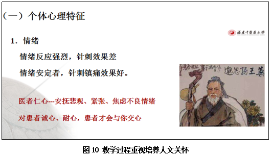 由于病痛折磨,病人情绪低落、焦虑、紧张等不良情绪较常见,讲授心理特征对针灸效应影响时,提倡临床坚持以病人为本,感同身受她们的疾苦,安抚病人不良情绪,把人文关怀融入临床诊疗。