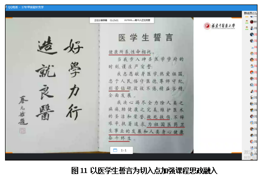 根据课程特点,围绕教学大纲,课程通过qq视频直播、同步SPOC课程和qq群聊,讲授课程重点和难点并进行答疑,实时进行课堂互动,将专业课程与思政元素有机融合,结合疫情,课程思政元素融入教学始终。