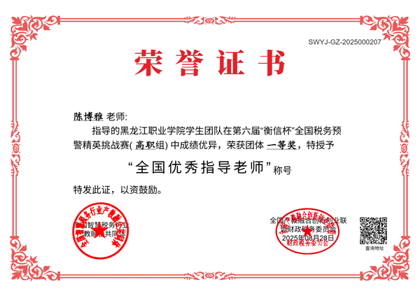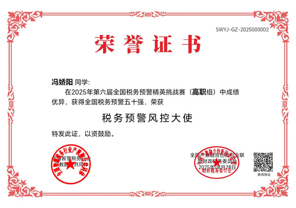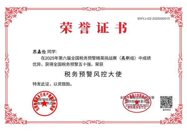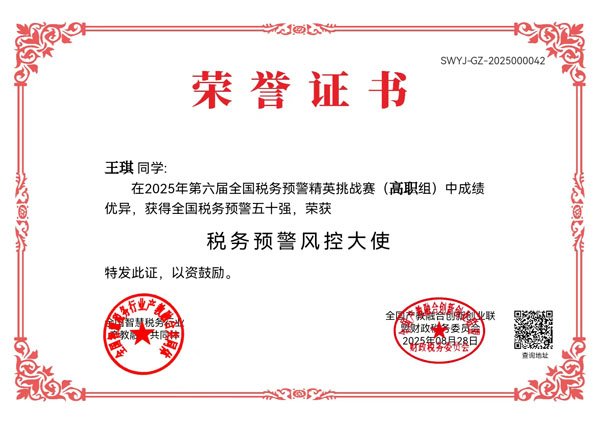 2025年8月1日—8月22日,在第六届“衡信杯”全国税务预警精英挑战赛中,会计金融学院由陈博雅、杨鑫慧组成的指导教师团队,组织大数据与财务管理专业、大数据与会计专业共35名学生积极参赛,最终在全国68所高职院校竞技中获得全国总排名第一、团体一等奖的好成绩。冯骄阳、苏嘉伦、王琪、任政睿、唐静等24名学生脱颖而出,进入全国排名前50,获得“税务预警风控大使”荣誉,2位指导教师分别获得“全国优秀指导教师”称号。