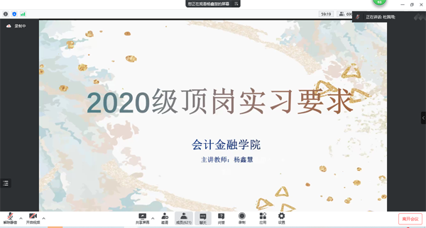 5月31日,会计金融学院线上组织召开了企业宣讲会暨2020级顶岗实习动员会。学院院长张利、黑龙江大账房财税咨询有限公司经理樊云岭、学院实习指导教师以及2020级全体学生参加会议。会议由学院副院长杜国用主持。