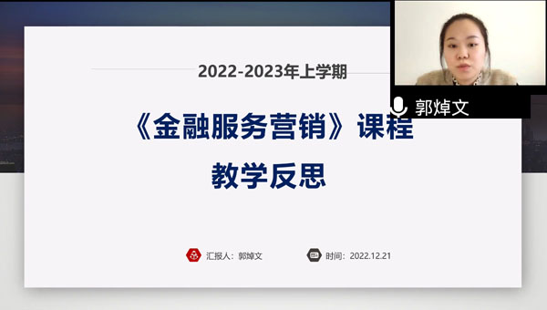 金融服务与管理教研室教师郭焯文针对所讲授的《金融服务营销》课程,总结反思了课程教学模式的适切性、教学方法的有效性、学习成效评价的多元性,以及如何调动学生学习主动性。