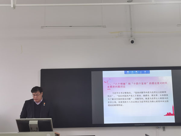 党总支书记张振和对深刻认识和理解习近平新时代中国特色社会主义思想中“八个明确”和“十四个坚持”的科学内涵及其相互关系从三个方面进行了阐述:“八个明确”和“十四个坚持”的提出是对时代发展的问题回应;全面掌握“八个明确”和“十四个坚持”的理论内涵;深刻理解“八个明确”和“十四个坚持”的逻辑关系。他指出,全体党员要持续深入学习领会、全面贯彻落实以“八个明确”和“十四个坚持”为主要内容的习近平新时代中国特色社会主义思想,做好深化内化和转化的工作,从习近平新时代中国特色社会主义思想中汲取奋发进取的智慧和力量,紧紧围绕落实立德树人根本任务,坚持为党育人、为国育才,全面提升人才培养质量,努力在贯彻落实、推动学校事业高质量发展上取得新进展,在全面建设社会主义现代化强省中展现“龙职”担当。