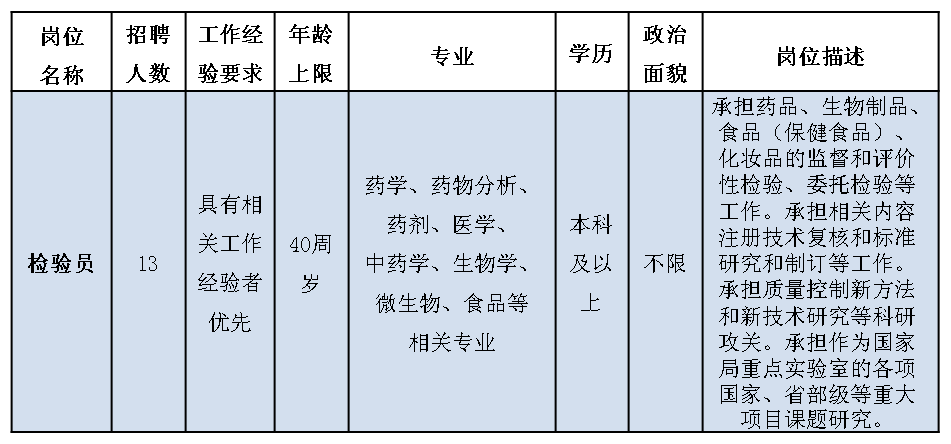 市食品药品检验所正在招聘13名检验员,检验员岗位应聘者需具有相关专业背景,年龄上限为40周岁,如为博士研究生或者具有高级职称的,年龄可适当放宽至45周岁及以下。本次报名采取电子邮件报名方式,应聘人员请于6月30日前将填写后的《公开招聘工作人员报名表》、电子照片、学历证明及其他资格证书等材料以电子邮件形式发送至shsyjszp@163.com邮箱。