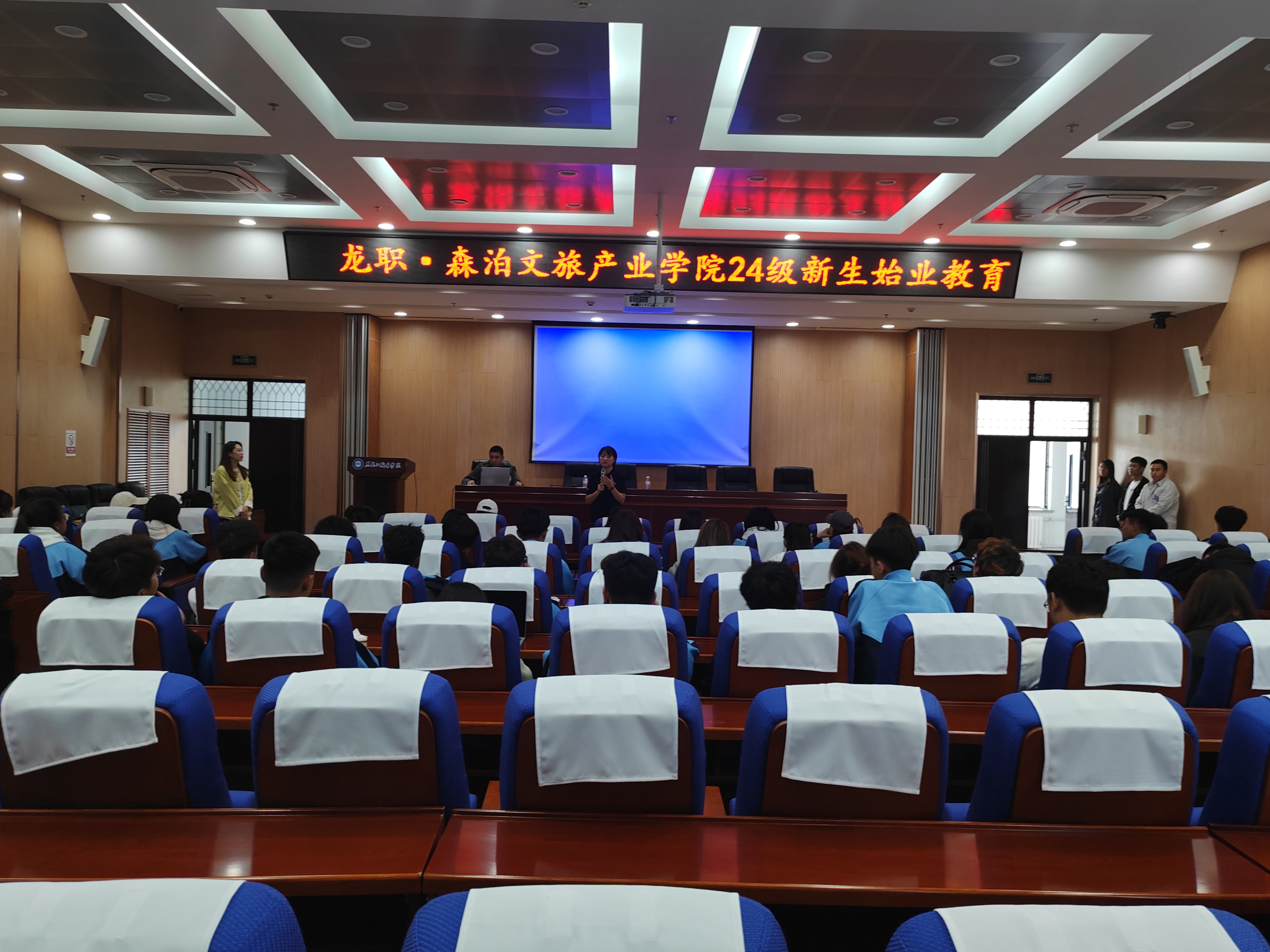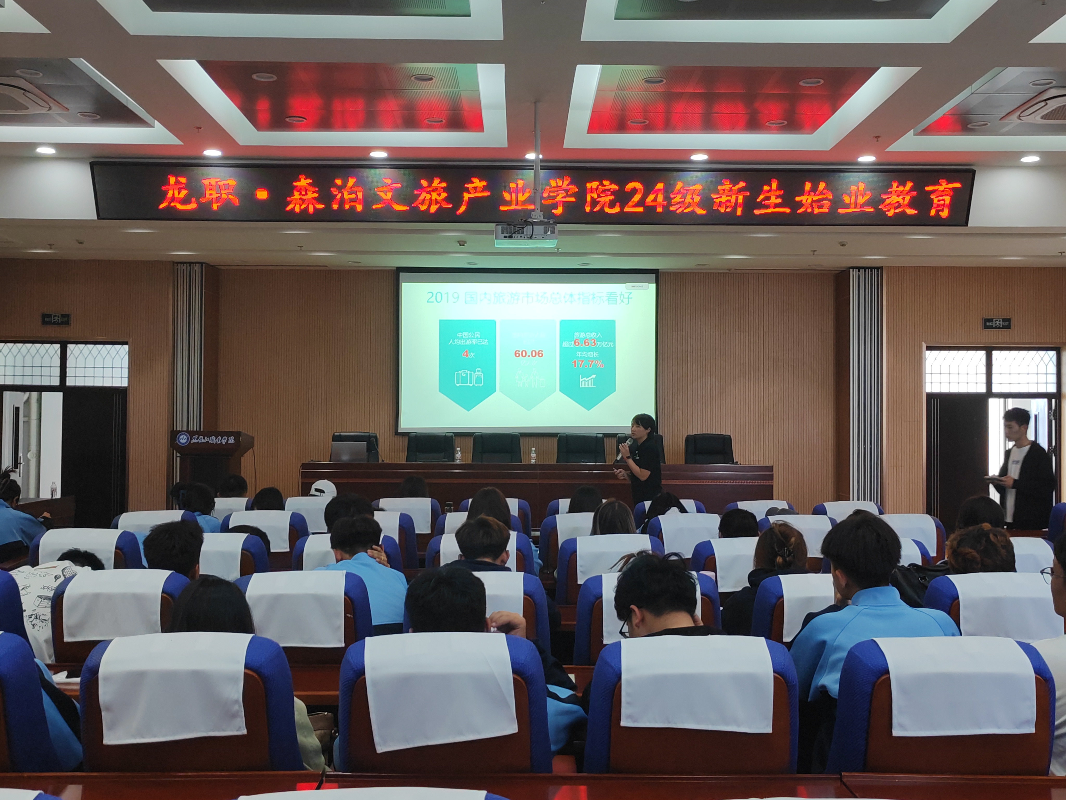 为了全面推进人才培养工作的高质量发展,通过始业教育提升学生对文旅行业和专业特色的认知,培养同学们的职业意识,2024年9月24日下午,龙职·森泊文旅产业学院开展了24级新生始业教育。杭州开元森泊管理公司的招聘总监吴燕、招聘经理牟少康来伟德官网为24级旅游管理专业同学做了始业教育讲座,旅游管理专业教师以及23级部分同学一同参加了本次讲座。