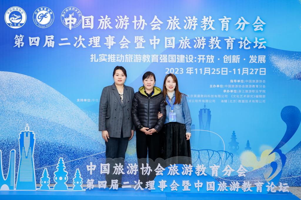 2023年11月26日,旅游人文学院院长刘莉、旅游管理教研室主任陈洪宏、专业辅导员梁婧赴杭州参加了中国旅游协会旅游教育分会第四届二次理事会。来自全国的专家学者、特邀嘉宾、会员代表等400余人参加了会议。本次会议旨在汇思想、集众智,凝共识、聚合力,共商旅游教育发展,共谋产教融合创新,推动新时代旅游教育高质量发展,为后疫情时代的旅游人才培养、旅游业的高质量发展破题破局。