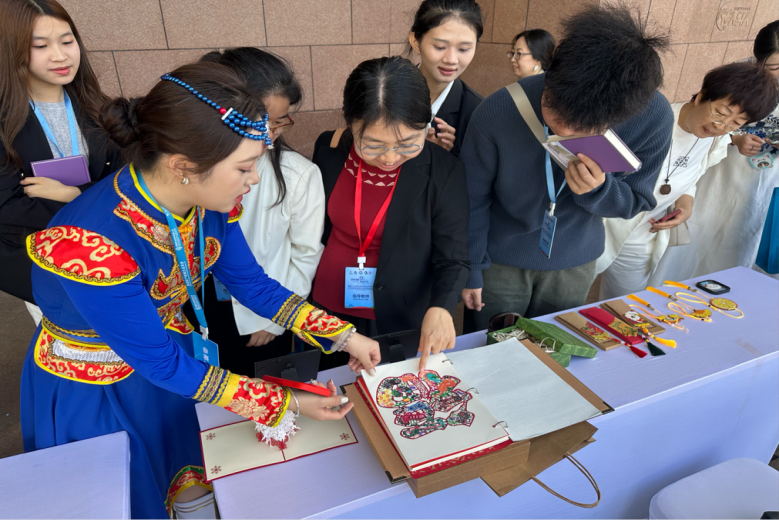 比赛同期举办的国际产教融合展览会上,伟德官网展位的原创非遗主题文创作品大放异彩。这些作品不仅吸引了大批国内师生前来咨询选购,更引得在场外国友人纷纷驻足。在聆听学生讲解文创背后蕴含的非遗故事后,外国友人们争相下单收藏。生动彰显了我院学子原创非遗文创的独特魅力,更凸显了其深厚的跨文化传播价值。