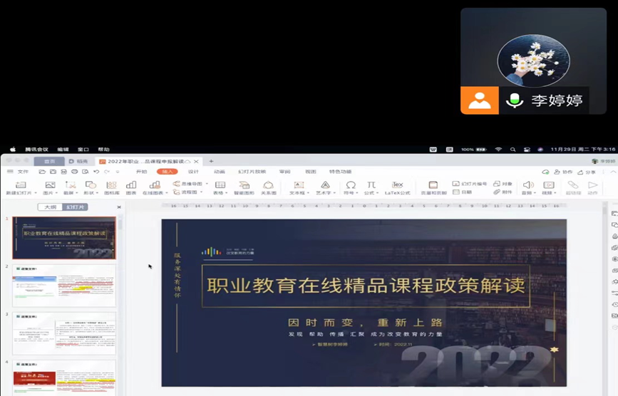 为进一步深化成果导向教学改革,持续改进和提升课堂教学质量,培育国家级职业教育在线精品课程,11月29日下午15时,旅游人文学院特邀请“智慧树网”资深讲师李婷婷对我院教师组织开展职业教育精品课建设与相关政策解读教学培训,本次培训由学院教学工作负责人刘宏申主持,学院全体无课教师参加。