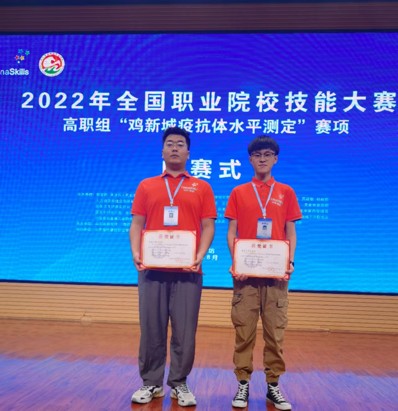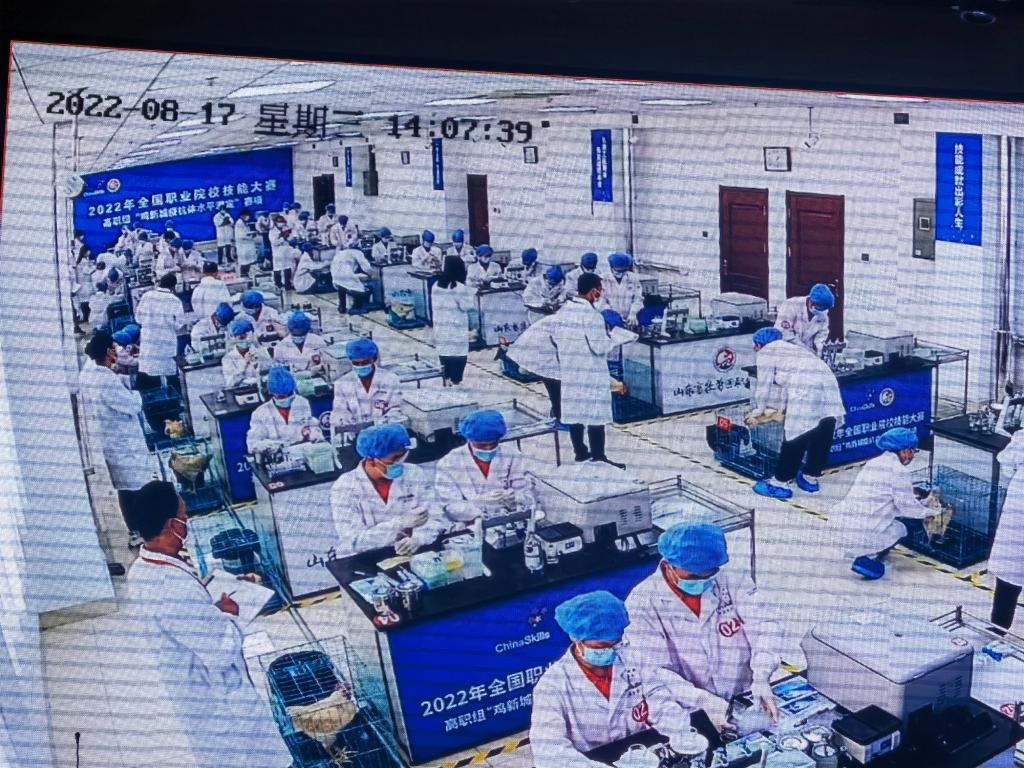 8月17至18日,2022年全国职业院校技能大赛高职组“鸡新城疫抗体水平测定”赛项在山东潍坊成功举办。来自全国28个省份的51支代表队参加了比赛。农牧工程学院杨井坤、周扬两位老师指导的动物医学专业郝雷、梁铭航两名参赛选手,凭借稳定发挥荣获三等奖。