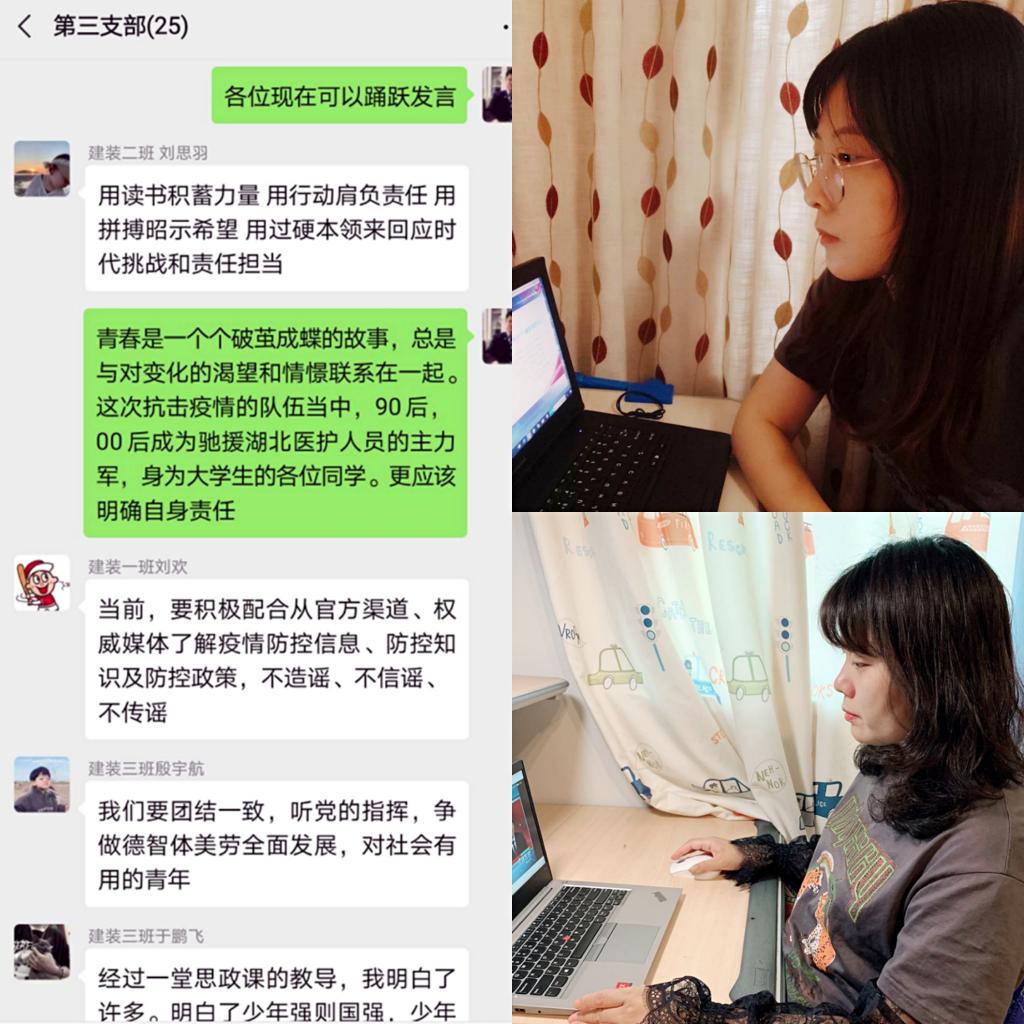 课后,支部全体教师及学生党员、积极分子开展在线学习讨论。通过本次思政学习与讨论,师生更加坚定了打赢这场抗疫攻坚战的信心和决心。更加深刻认识到了中华民族是不屈不挠,敢于战胜困难的伟大民族。无数“逆行”的抗疫英雄用无私无畏、勇于牺牲的精神,充分说明了当代中国青年是值得信赖、堪当大任、奋斗有为的一代。