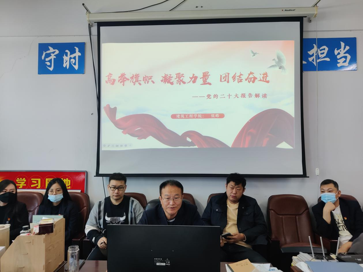 为深入开展学习贯彻习近平新时代中国特色社会主义思想主题教育,全面贯彻党的二十大精神,4月26日下午,建筑工程学院副院长张皓为学院师生上《高举旗帜凝聚力量团结奋进——党的二十大报告解读》主题教育专题党课。学院领导班子成员、全体教职工、学生党员在清华楼1117会议室及线上直播两个会场共同参加学习。