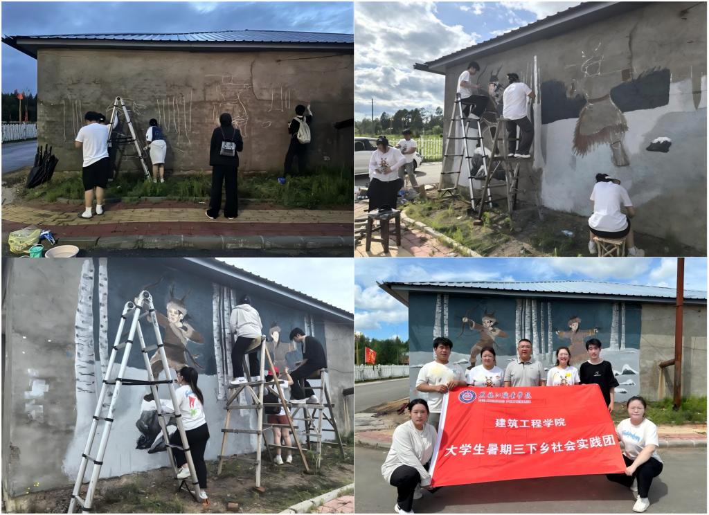 实践团队员们充分发挥专业特长,结合当地乡村改造需求和鄂伦春民族的文化特色,于7月4日至5日在民族风情园的墙体上,精心创作了以鄂乡民族英雄盖山和关丽华为主题的墙体画。这些画作不仅展现了鄂族的自然风光、民俗风情和英雄形象,更为乡村增添了浓厚的艺术氛围,创作过程中吸引了众多游客和村民驻足打卡,现已成为乡村一道亮丽的风景线。