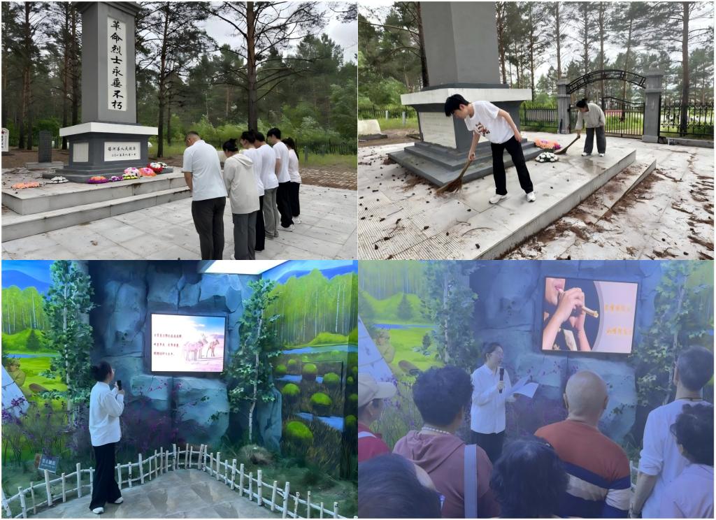 正值抗日战争胜利八十周年之际,在兴安岭茫茫林海中,鄂伦春族先辈们沐浴烽火的洗礼,谱写了一部可歌可泣的斗争史,形成了具有研究价值的民族精神与民族文化。在山上抗联遗址,队员们沿着先辈们的足迹,重温那段艰苦卓绝的抗战历史。来到烈士陵园,大家向为国捐躯的鄂族抗日英雄们敬献花篮,以表达深切的哀悼与敬意。走进鄂乡民俗馆内,团队队员刘鑫蕊化身小导游,她以鄂族抗日英雄盖山和关丽华的故事为背景,带领游客们触摸历史脉络,以文物为匙打开尘封的时光,用故事作舟横渡岁月的长河,她的精彩讲解得到了现场观众的一致认可。