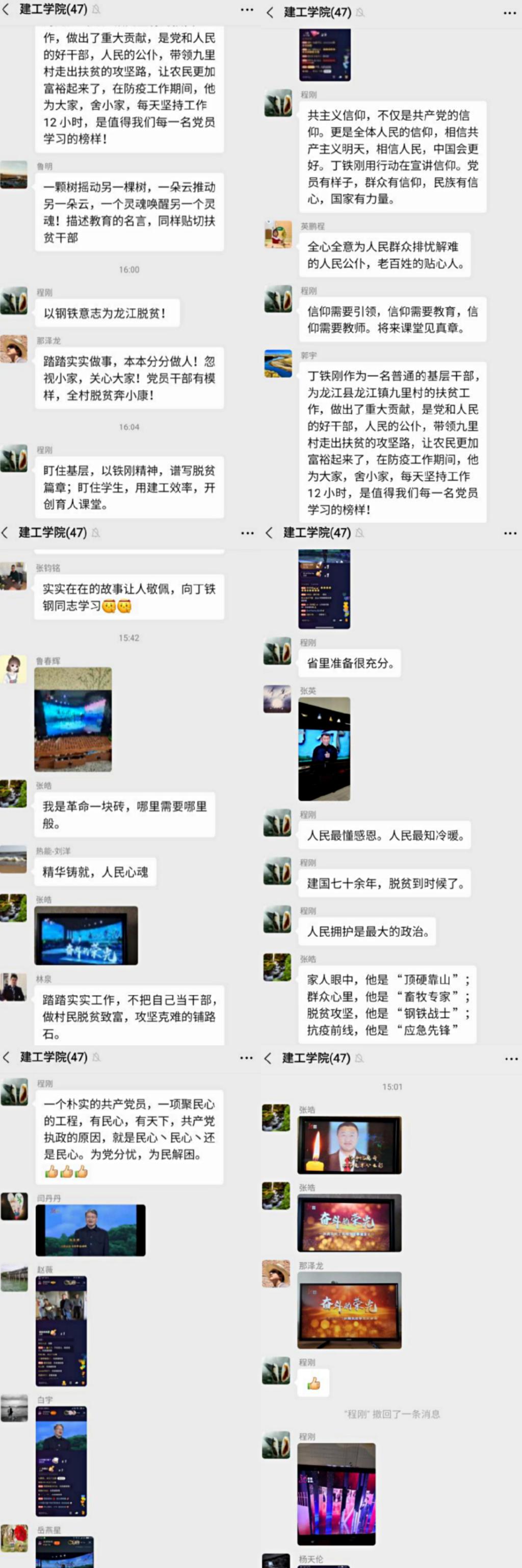 平时惜字如金的无党派老教师刘洋一直看到结束,他用“精华铸就,人民心魂”来评价丁铁刚的事迹。无党派青年教师郭宇表示:“丁铁刚作为一名普通的基层干部,为龙江县龙江镇九里村的扶贫工作,做出了重大贡献,是党和人民的好干部,是人民的公仆,带领九里村走出扶贫的攻坚路,让农民更加富裕起来了,在防疫工作期间,他为大家,舍小家,每天坚持工作12小时,是值得我们每个人学习的榜样!”