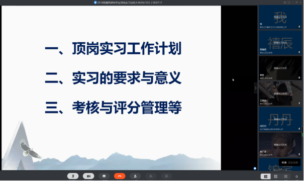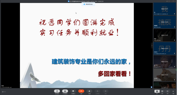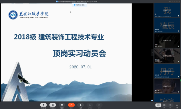 7月1日下午14:00时,建筑工程学院建筑装饰专业利用“钉钉”软件召开了“顶岗实习云端动员大会”。建筑装饰专业7位专任教师及2018级全体建筑装饰专业学生出席了本次动员大会。