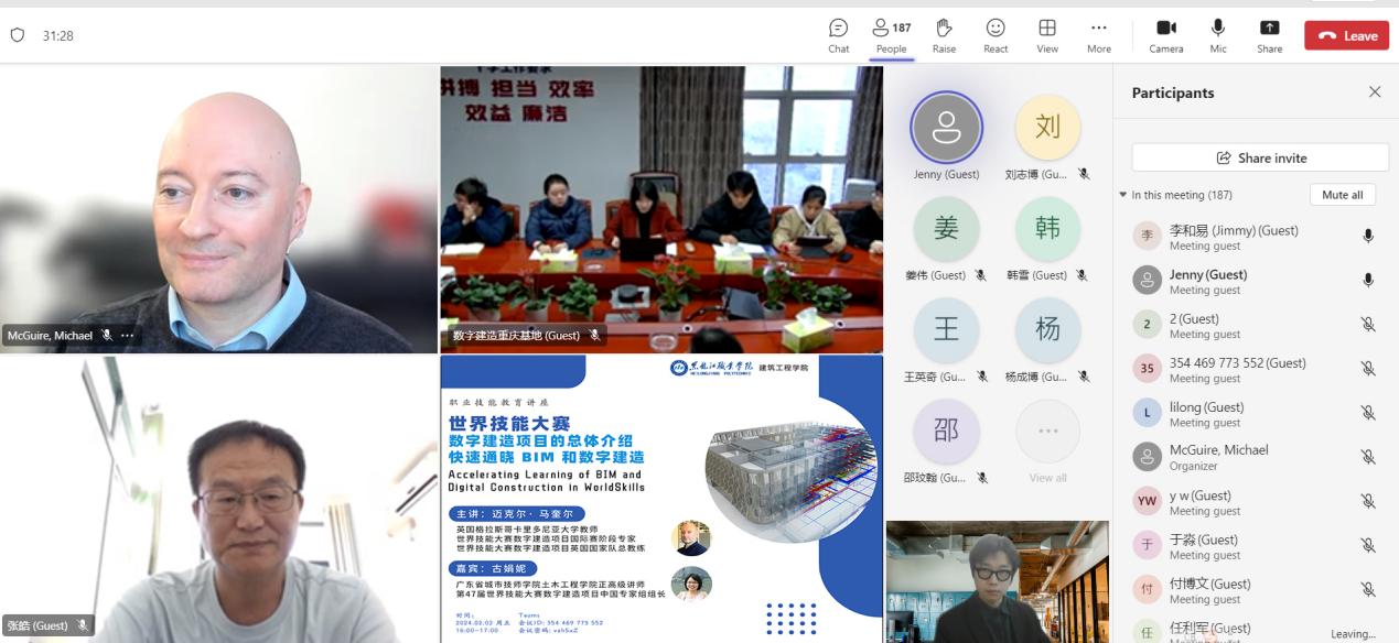 bevictor伟德官网建筑工程学院于2024年2月2日16:00-17:00成功举办了一场线上讲座,邀请到了英国格拉斯哥卡里多尼亚大学的迈克尔·马奎尔教授(世界技能大赛数字建造项目国际赛阶段专家、世界技能大赛数字建造项目英国国家队总教练)和第47届世界技能大赛数字建造项目中国专家组组长古娟妮教授作为主讲及嘉宾;建筑工程学院主要领导,全体教师及学生代表参加本次讲座;同时与会的还有,第47届世界技能大赛中国区数字建造集训(重庆基地)竞赛组委会专家团以及7名国家队选手。本次讲座围绕世界技能大赛数字建造项目展开,为我院师生带来了一场知识的盛宴。