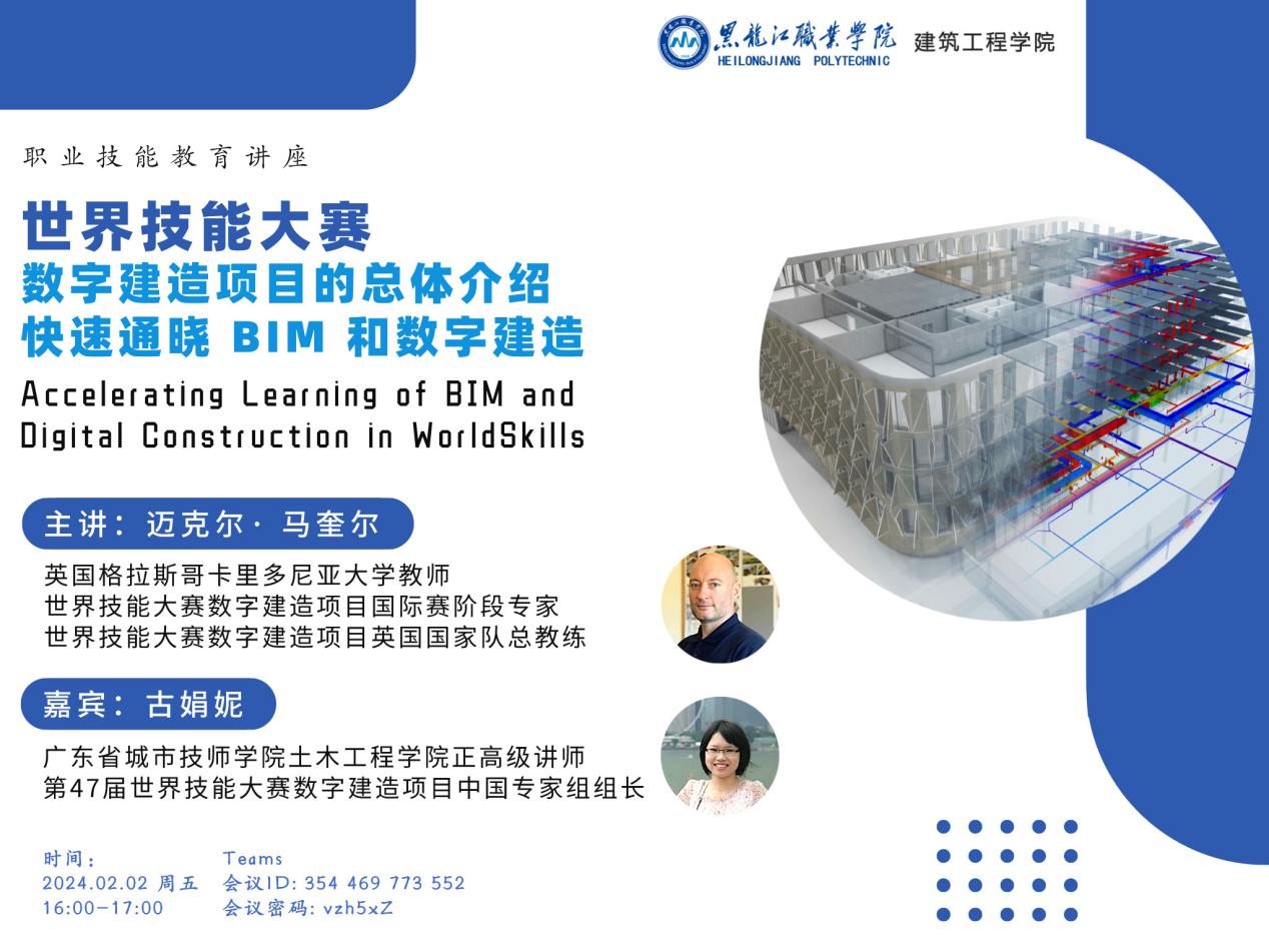 本次讲座《世界技能大赛-数字建造项目的总体介绍-快速通晓BIM和数字建造》的宣传海报