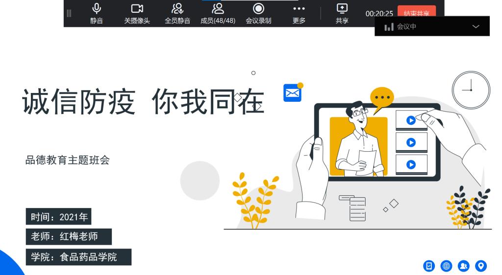 响应学院引导教育学生提升疫情防控主人翁意识的号召,筑牢学生诚信意识,为疫情防控助力。11月4日中药制药2101班通过钉钉视频召开线上“诚信防疫,你我同在”的主题班会。