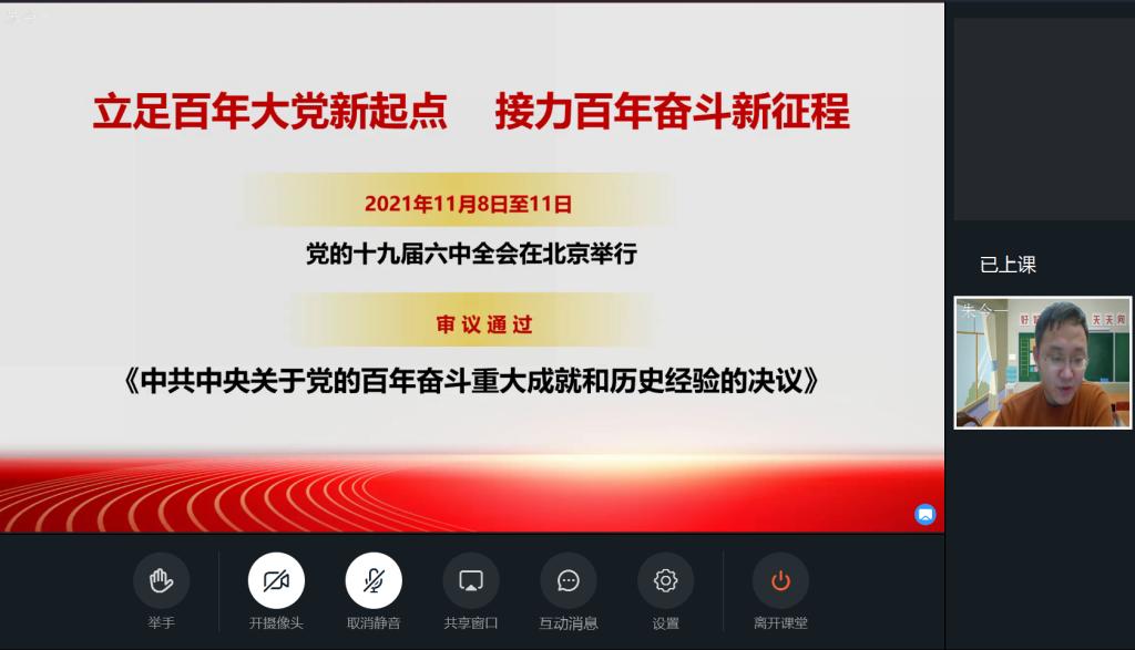 为推动党的十九届六中全会精神学习贯彻深入基层,教育引导广大师生深刻领悟“两个确立”的决定性意义,增强“四个意识”、坚定“四个自信”、做到“两个维护”,3月23日,学校宣讲团教师朱今一到我院进行了学习贯彻十九届六中全会精神线上宣讲活动。食品药品学院党总支书记陈晓华、院长赵岩、党总支副书记高财智、教学副院长韩双出席报告会,全体教师、在校学生近800人参加了此次报告会,宣讲报告会由食品药品学院组织员芦清主持。