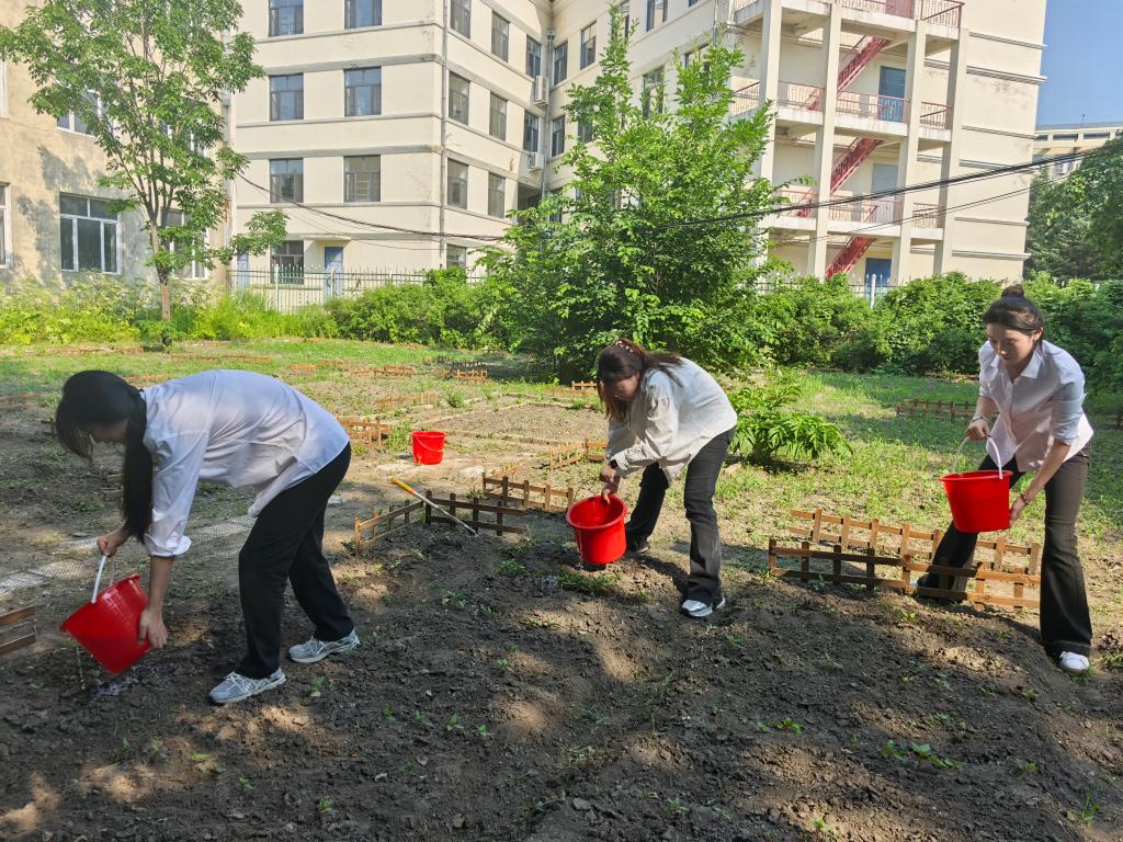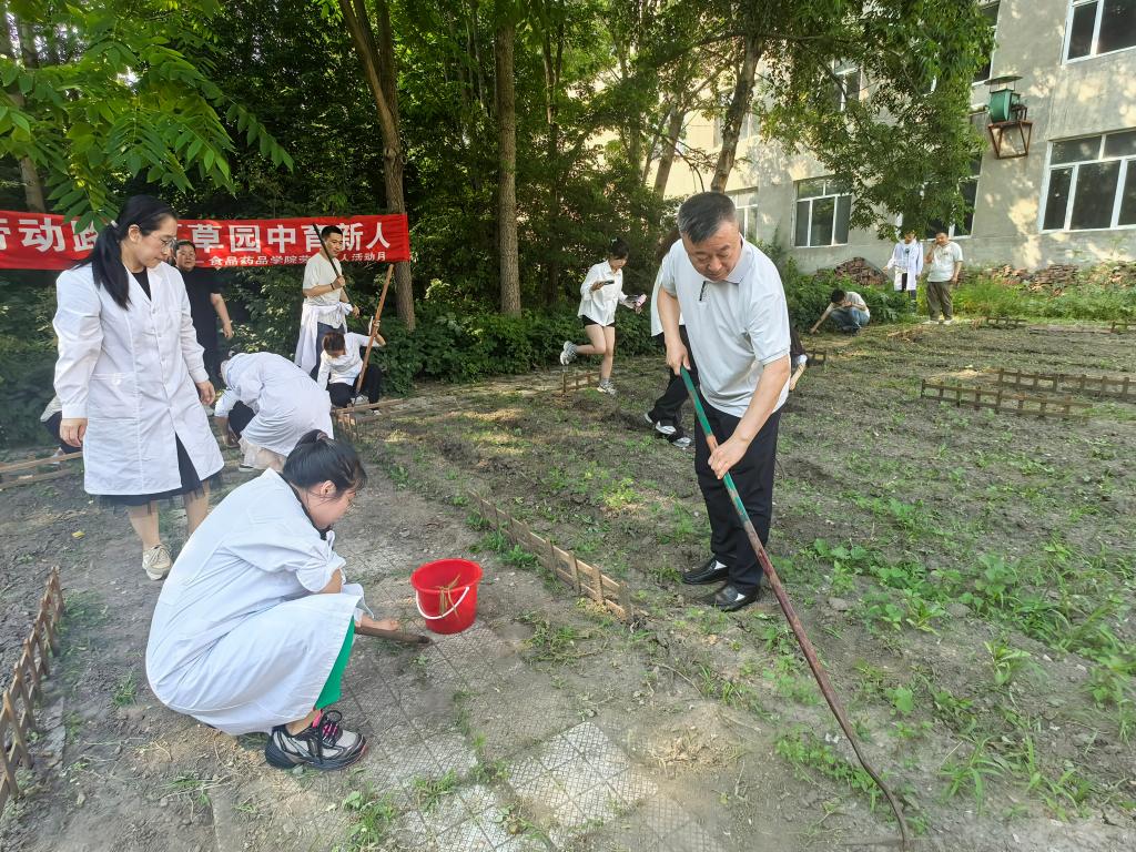 师生们共同除草、松土、浇水和植株维护等工作,专业教师董术发结合实践环节,现场讲解药用植物的栽培技术、生长特性及药用价值,将课堂知识与劳动实践紧密结合。