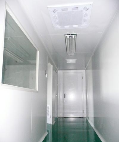 模式洁净实验室按照药品生产工艺流程,设置淋浴室、缓冲室、一更室、二更室、粗洗室、精洗室、制水室、洁净室、配制分装室和空调机房。