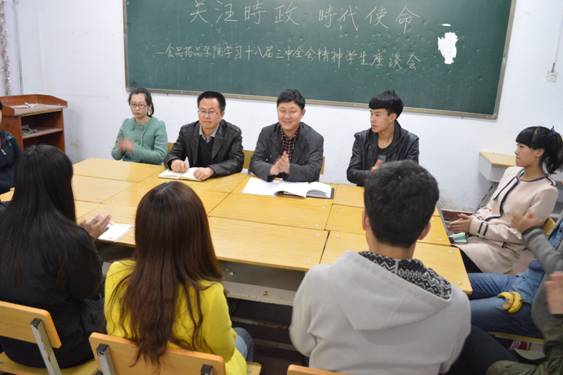 2014年3月27日18时,学管办组织各班学生代表开展了以“关注时事,了解时事”为主题、学习贯彻党的十八届三中全会精神的座谈会。车延平副院长以及左远鹏副主任参与了此次活动,并对党的十八届三中全会上习近平总书记的重要讲话进行了全面的分析解读。车院长向学生们介绍了党的十八届三中全会传达的主要精神,同时还向学生们深入解读了“中国梦”这一概念, “中国梦”是中国共产党召开第十八次全国代表大会以来,习近平总书记所提出的重要指导思想和重要执政理念,全面概括了中国的发展方向。座谈会期间学生代表纷纷发言、阐述各自独到的见解,充分体现了学生们对学习贯彻党的十八届三中全会精神的认知与理解。车院长在总结中指出,我院将举办更多此类活动,从而更全面地了解大学生心理,大力提高大学生的素质教育。