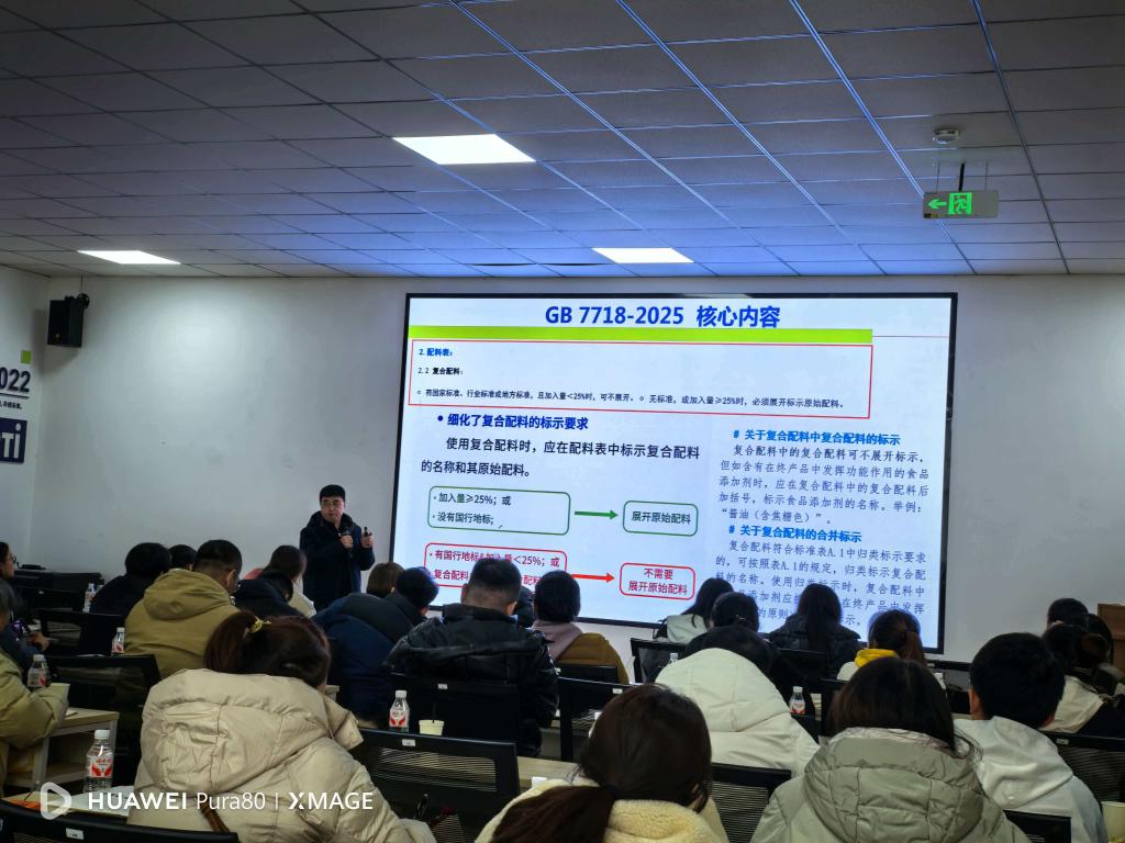 培训围绕GB 7718《食品安全国家标准 预包装食品标签通则》的最新版本要求展开,系统讲解了标签标识的合规要点、常见错误及企业应对职业打假行为的策略与方法。参会教师深入学习了企业在实际生产中如何依据国家标准进行标签设计、审核与风险防控,并就标准更新对企业运营的影响进行了交流研讨。