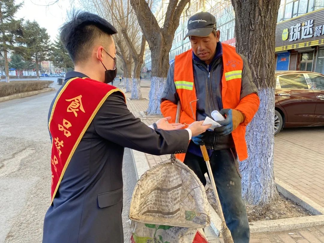 一大早,学生会成员就来到大街上,为环卫工人送上关怀,分发口罩。学生会成员向环卫工人表示了来意,环卫工人见了也立马停下手里的工作,微笑又稍微腼腆地接下口罩,表示非常感谢同学们送来的口罩,希望口罩能帮助他们进行自我防护,继续维持和谐的城市环境。