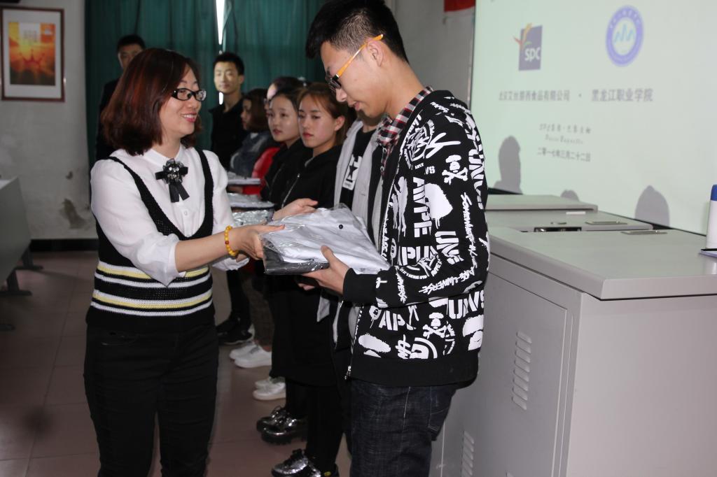 3月22日下午13时10分,食品药品学院现代学徒制合作企业北京艾丝碧西食品有限公司人力资源总监胡娜女士,招聘培训部主任李峰先生再次深入校园探访首届巴黎贝甜现代学徒制班学员,并带来了企业的关怀,胡娜女士还为学员上了精彩一课。之后,15时整在2号实训楼410代表公司为学员发放员工制服,活动现场气氛温暖、和谐。食品药品学院院长丁原春、学管副院长车延平、三办主任、相关专业主任及部分教师一同分享了巴黎贝甜现代学徒制班53名学员身着员工制服的幸福和喜悦,活动由教学办主任韩双主持。