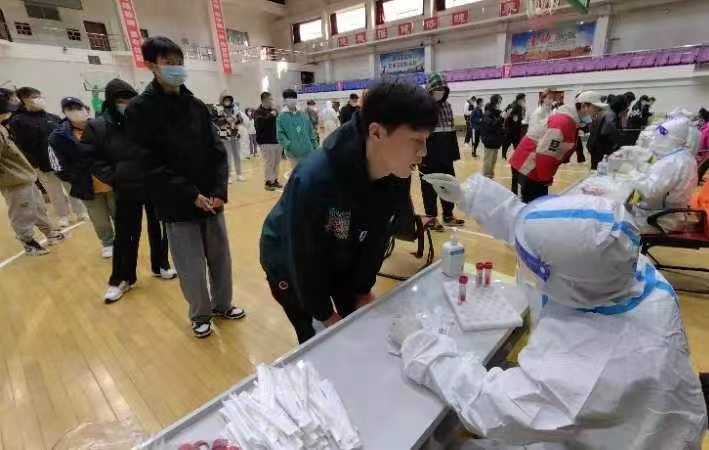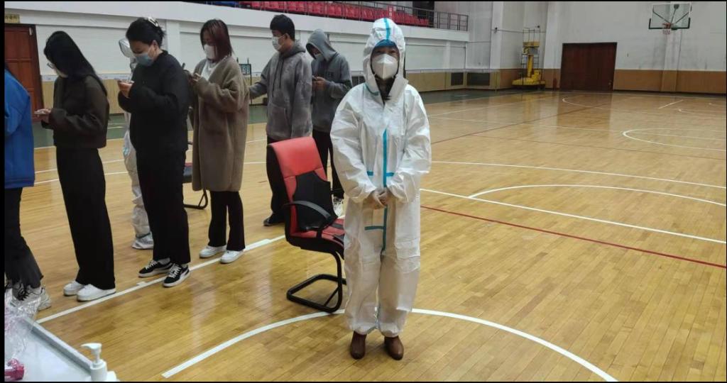 (周敏、王丽在体育馆为学生核酸检测)