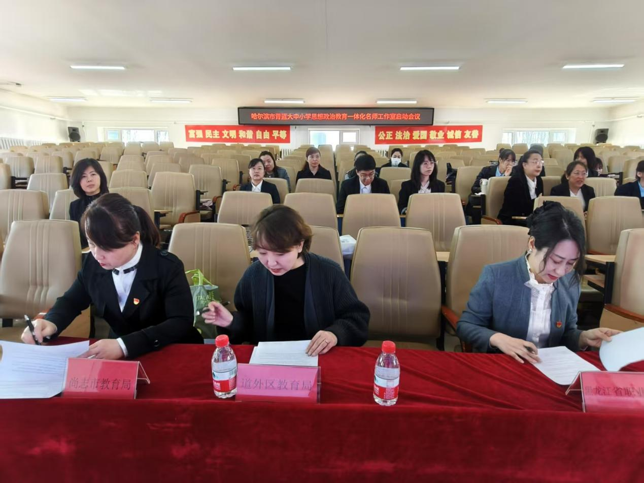 4月15日,马克思主义学院形势与政策教研室教师参加了哈尔滨市青蓝大中小学思想政治教育一体化名师工作室启动仪式,出席本次启动仪式的还有道外区教育局分管负责同志、尚志市教育局分管负责同志,以及道外区、尚志市各学段教师。