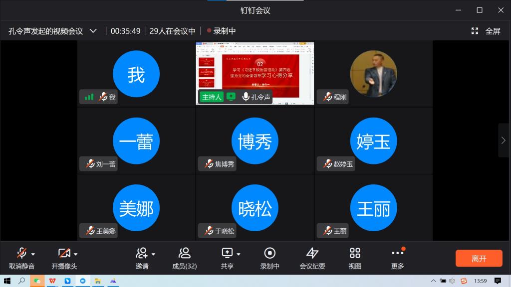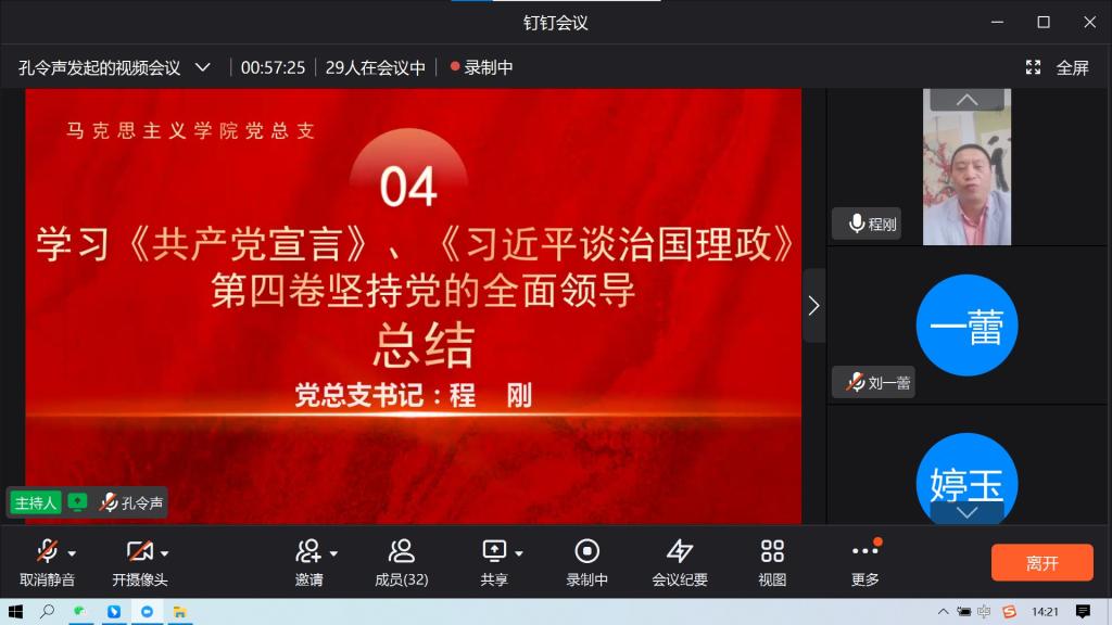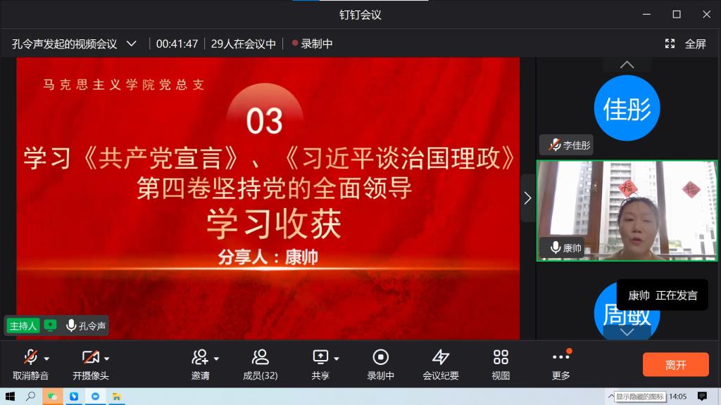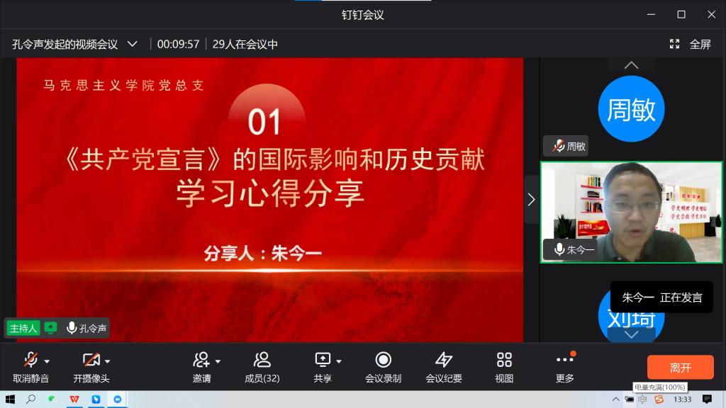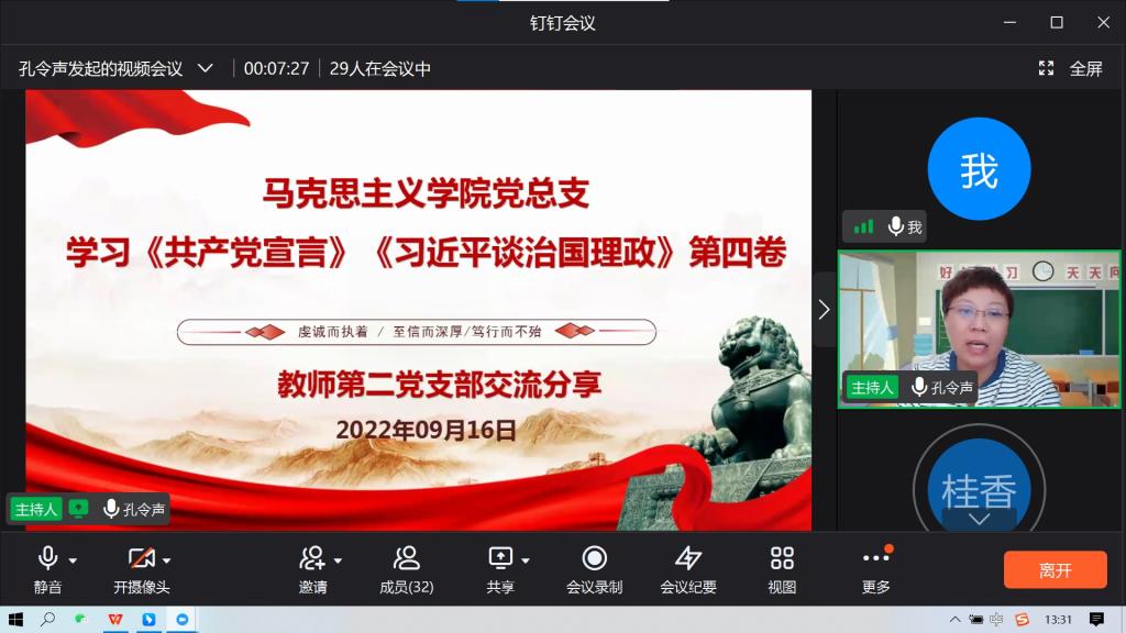 为迎接党的二十大胜利召开,在马克思主义学院党员中形成理论学习的新热潮。马克思主义学院党总支于2022年9月16日下午1点30分召开集体理论学习,本次集体学习由教师第二支部负责主持和分享,支部书记孔令声主持,马克思主义学院党总支全体党员参加,采用钉钉会议线上进行,学习内容主要包括《共产党宣言》和《习近平谈治国理政》第四卷。