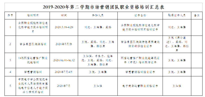 在此期间,市场营销团队从2020年3月份到7月份每月都有相应的培训内容,从信息化教学能力提升、区块链技术、网店运营推广、智慧营销到大数据培训共计有6次不同项目的专业培训,8位教师共完成27人次的培训项目,已经有10人次获得了资格证书,彰显了市场营销团队教师积极的学习态度和强大的学习能力。
