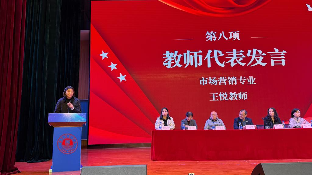 教师代表市场营销专业教研室主任王悦发言说,做主动的探索者,敢迈出第一步比标准答案更有价值,每一次小小的尝试、每一次细微的探索,都是在为未来的职业道路铺垫基石。“做扎实的学习者”。沉下心来学好专业核心知识,筑牢理论根基,让自己的知识体系经得起推敲;也能主动拥抱数字技能,学习那些能为商贸领域赋能的实用工具,努力成长为“懂商贸逻辑、通数字技术”的复合型人才。“做温暖的同行者”。希望大家能主动打开心扉,在团队合作中学会倾听与包容,在集体活动中收获真挚的友谊;遇到难题时,别怕向同学伸出援手,也别犹豫向老师寻求帮助——数字商贸学院是一个温暖的大家庭,我们会始终站在你们身后,为你们的成长保驾护航。
