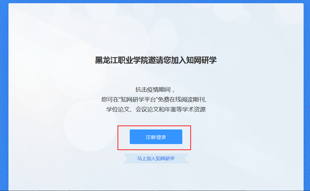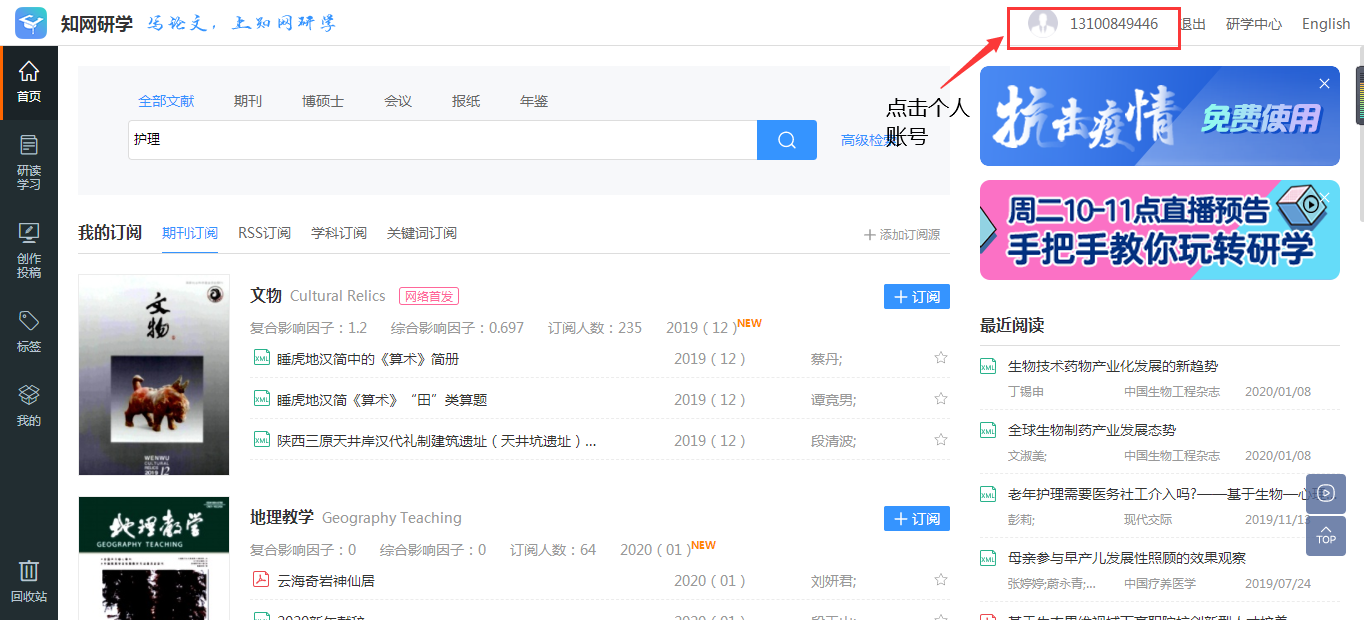 第二步:登录个人的知网账号,就可以在校外免费使用知网研学平台(网址:x.cnki.net)。