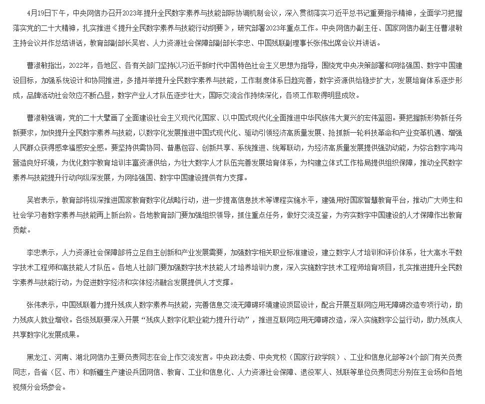 中央网信办召开2023年提升全民数字素养与技能部际协调机制会议