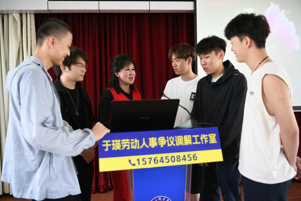 活动核心环节中,黑龙江首家以个人名字命名的“于瑛劳动人事争议调解工作室”负责人于瑛带来了“就业避坑指南”专题讲座。她结合大学生假期兼职、求职应聘等高频场景,系统拆解“五个兼职陷阱”“三种招聘骗局”,并传授维权技巧,为毕业生送上就业“暖心礼包”。讲座穿插多轮有奖问答,围绕“试用期权益”“社保缴纳”“兼职维权渠道”等热点问题展开。学生通过互动群踊跃抢答,累计参与超300人次,现场氛围热烈。这种“案例教学+即时检验”模式,让抽象法律知识转化为可感知、可运用的职场生存技能,有效提升学生法律应用能力。