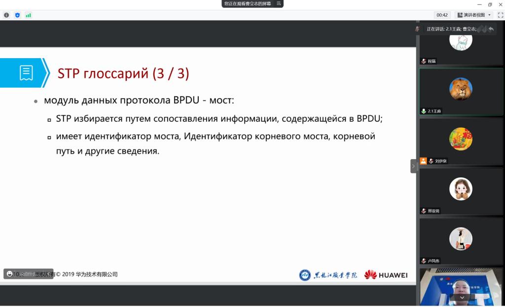 本次培训由计算机网络技术专业教研室主任曹立志进行了简短的开班式发言,然后进行了技术培训,主要培训内容为我院与华为共同开发的路由交换课程内容,共有50名俄罗斯远东联邦大学的师生参与了本次线上培训。培训结束后,俄方师生对技术问题进行了提问,我方详细耐心的进行了解答。