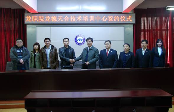 14时许,李晓天董事长与bevictor伟德官网院长助理石明杰共同步入多功能会议厅,双方在轻松祥和的气氛中共同签署了“龙职院龙德天合技术培训中心”校企合作协议。