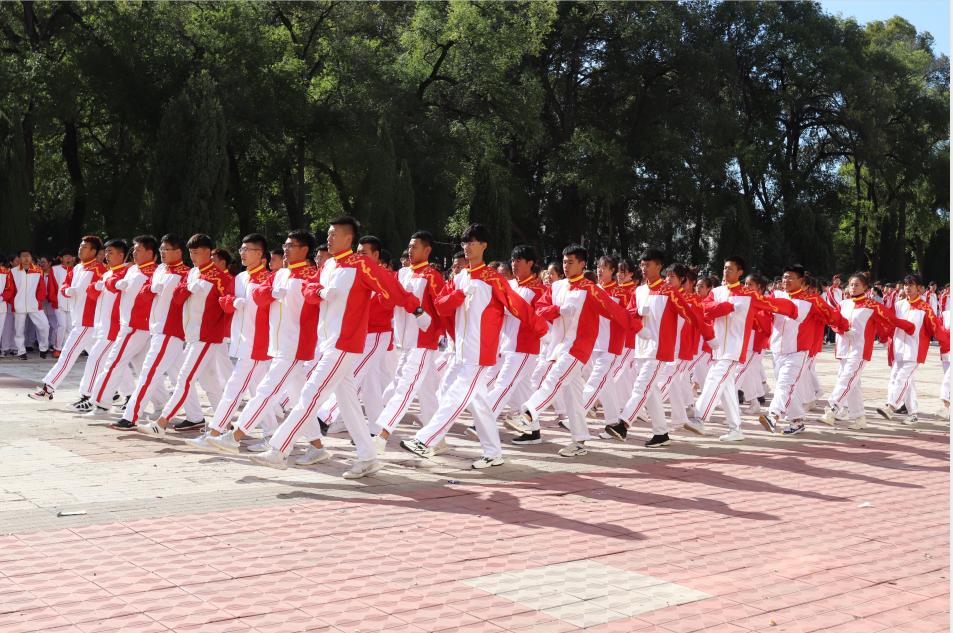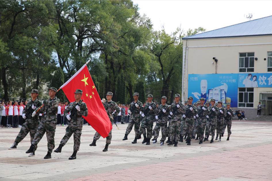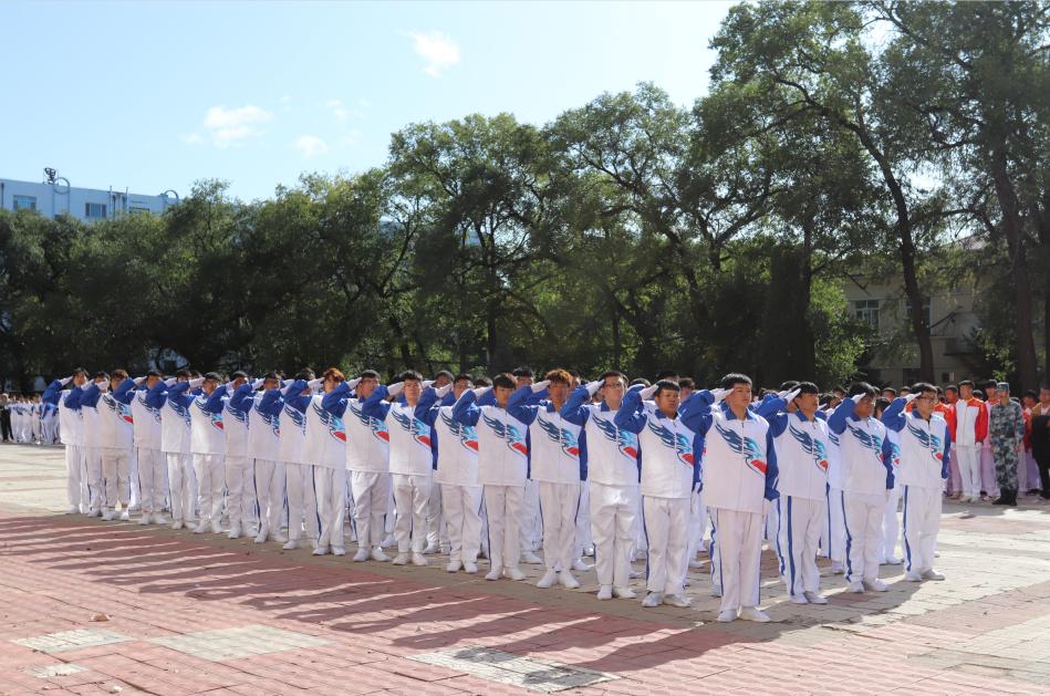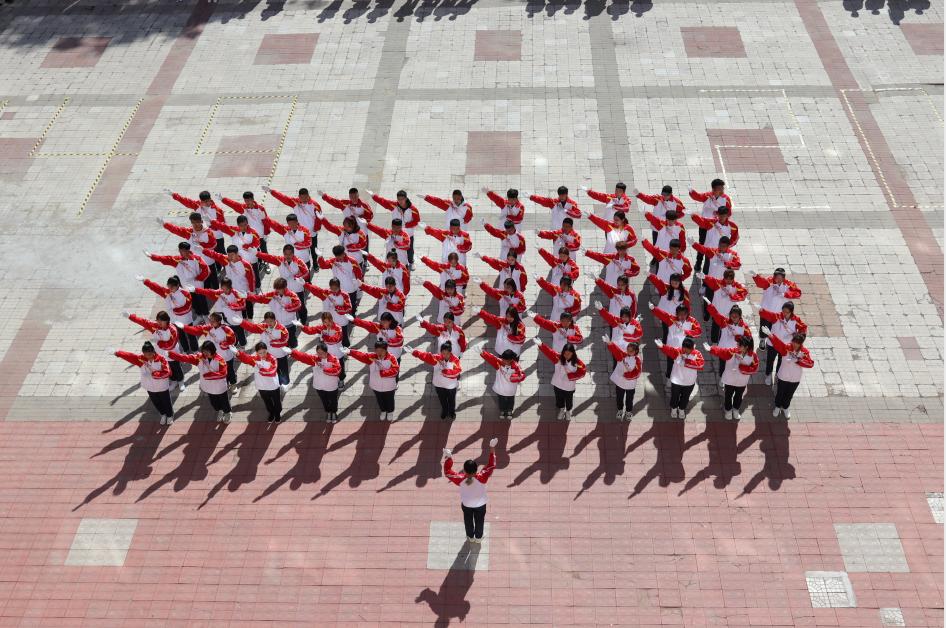 在大会即将结束之际,由学工部精心策划编排,1600余名师生共同参与演绎了《我和我的祖国》快闪活动,200名同学围绕国旗,拼凑成“1949——2019”字样,国旗护卫队员高举“国”“庆”二字,寓意新中国成立70周年举国欢庆之意,全体同学摇动手中红旗共同演唱《我和我的祖国》,充分展现了校区2019级“龙职”学子内心庆祝新中国成立70周年的爱国之情与喜悦之意,为期十几天的军训在同学们“祝贺伟大祖国繁荣富强”高声祝福中圆满结束。